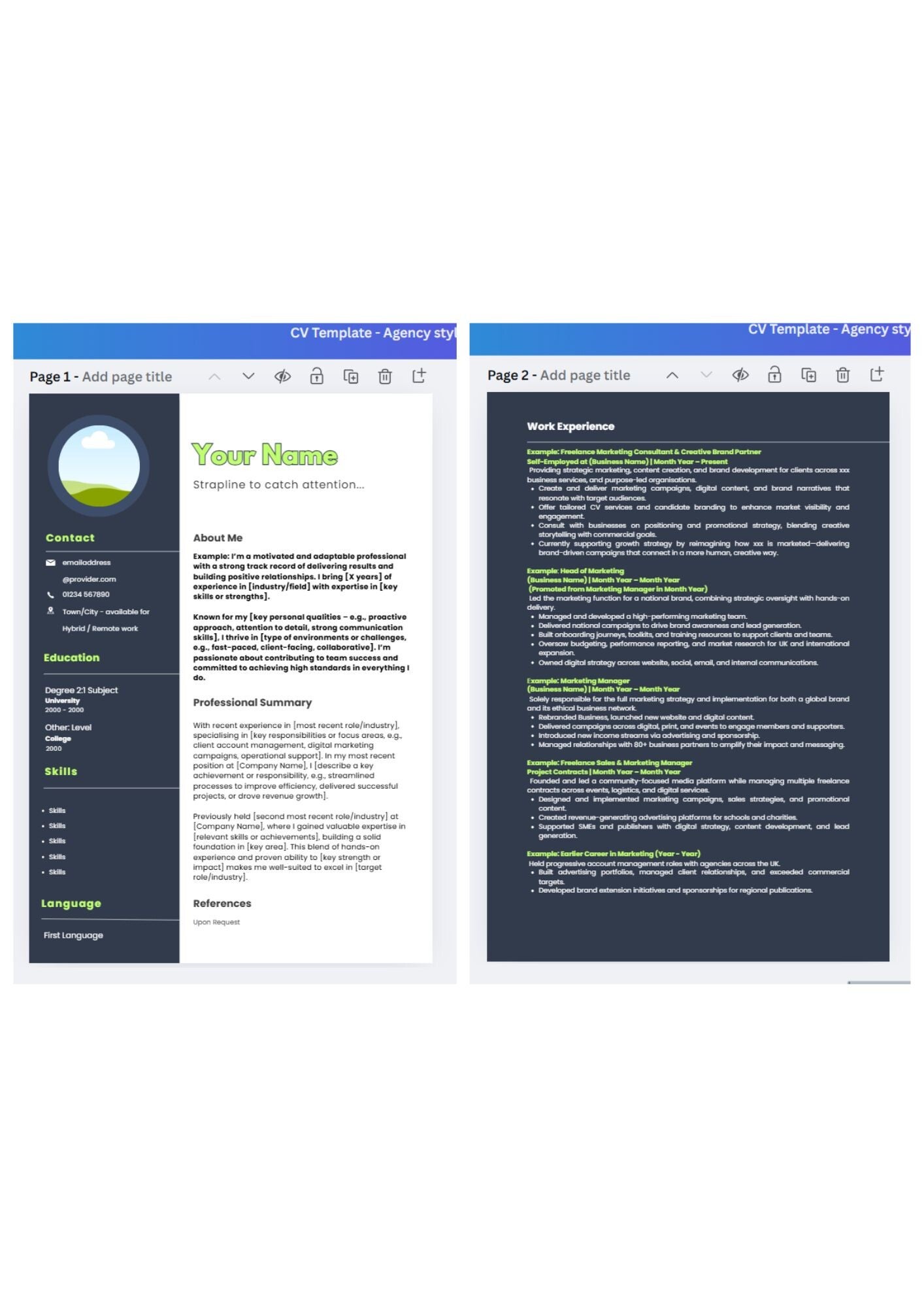 Stand out from the crowd with our Agency-style CV Template; this Canva template makes it easy to showcase your skills with style. This digital download will customise in minutes. Click below...